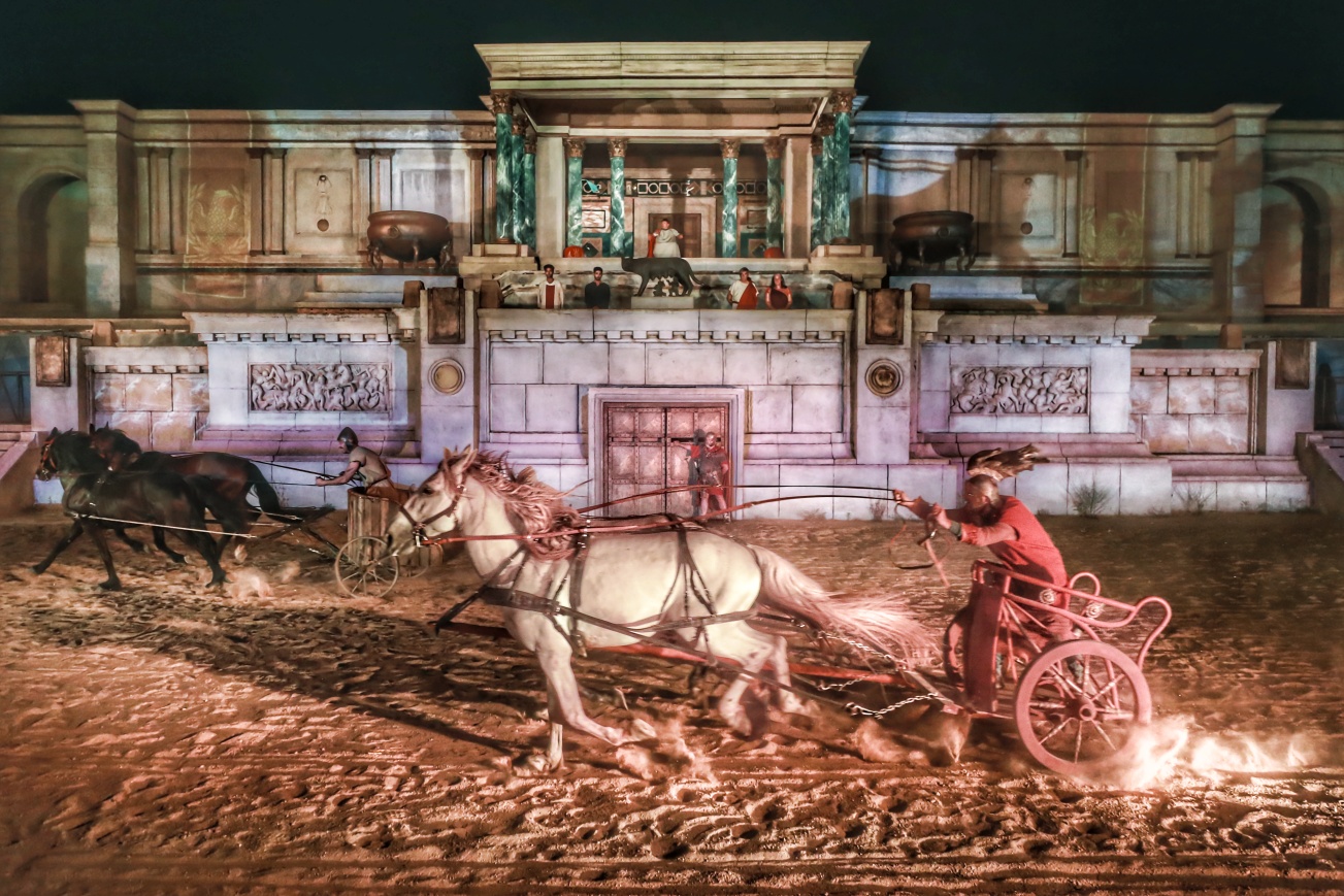 “Roma On Fire” si svolge nel Parco a tema Roma World, un’area interamente dedicata alla ricostruzione storica dell’Impero Romano. Qui, oltre 30 artisti, gladiatori, legionari, ancelle, ballerini, bighe e cavalli danno vita a uno spettacolo che fonde storia e spettacolarità. Attraverso l’uso innovativo di videomapping ed effetti speciali, il pubblico sarà trasportato nelle scenografie di film iconici come “Il Gladiatore” e “Ben Hur”. Il set cinematografico del kolossal “Ben Hur”, pluripremiato con 11 Oscar, ospita infatti questo straordinario show. Fedele riproduzione del Circo Massimo, il set offre una cornice maestosa e suggestiva per uno spettacolo che celebra la grandezza dell’Impero Romano. Gli spettatori vivranno un’ora di pura emozione, assistendo a una sfida epica carica di passione e azione.