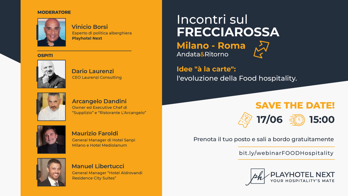 Nella prima tappa, in programma mercoledì 17 Giugno alle 15:00 su Zoom, si parlerà di Food Hospitality: moderati da Vinicio Borsi, esperto di politiche alberghiere, confronteranno le proprie esperienze Maurizio Faroldi, Dario Laurenzi, Arcangelo Dandini e Manuel Libertucci.