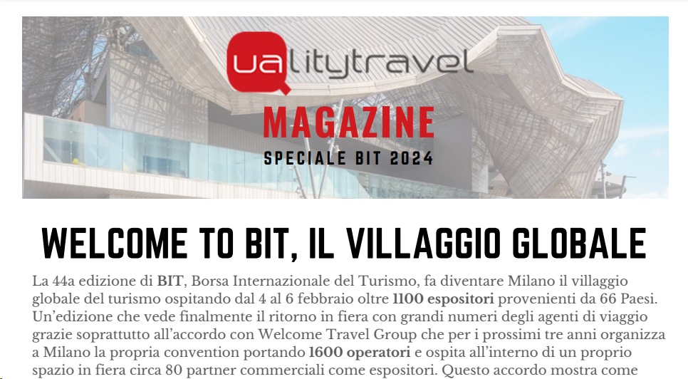E’ tutto pronto per BIT 2024, che, da domenica 4 a martedì 6 febbraio, accoglie all’Allianz MiCo di Milano viaggiatori e operatori della Travel Industry di tutto il mondo, per accendere i riflettori sulle novità del settore a livello globale ed offrire una piattaforma unica di promozione del prodotto turistico internazionale. Come sempre potrete seguire la fiera attraverso i nostri aggiornamenti quotidiani e con la guida Qualitytravel Magazine Speciale Bit 2024 che potere consultare / scaricare in pdf qui: