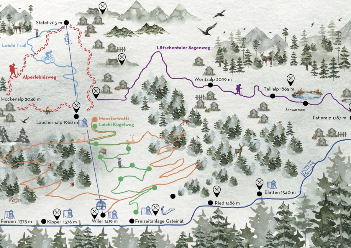 Loichi Kugelweg, il percorso delle biglie, è invece indicato in verde: un itinerario di circa cinque chilometri che attraversa la foresta del Baanwald e arriva all’area ricreativa «Gsteinät» a Wiler. Lungo la strada si incontrano dieci piste in legno, realizzate artigianalmente, per far rotolare le biglie acquistabili a 5 franchi in diversi punti vendita. Un’esperienza creativa e unica per tutta la famiglia.