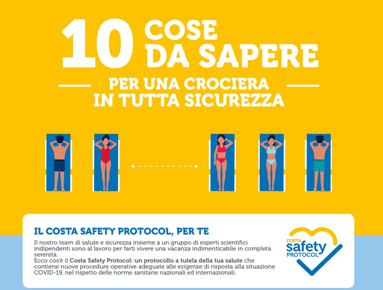 In attesa dell’autorizzazione finale per la ripartenza delle crociere, Costa Crociere annuncia l’introduzione a bordo delle sue navi del “Costa Safety Protocol”, un nuovo protocollo sanitario progettato appositamente per garantire la migliore esperienza di vacanza con la massima sicurezza. Il “Costa Safety Protocol” è stato sviluppato dalla compagnia italiana con l’aiuto di un gruppo di esperti scientifici indipendenti in sanità pubblica coordinati da V.I.H.T.A.L.I. (Value in Health Technology e Academy for Leadership and Innovation), spin-off dell’Università Cattolica di Roma, ed è conforme alle linee guida sanitarie nazionali e internazionali. Il protocollo include una serie molto ampia di misure e procedure, che coprono ogni aspetto della crociera, compresa la sicurezza dei membri dell’equipaggio quando ritornano a lavorare a bordo, il processo di prenotazione, le operazioni di imbarco e sbarco nei porti, l’esperienza a bordo, le escursioni a terra e l’assistenza medica.