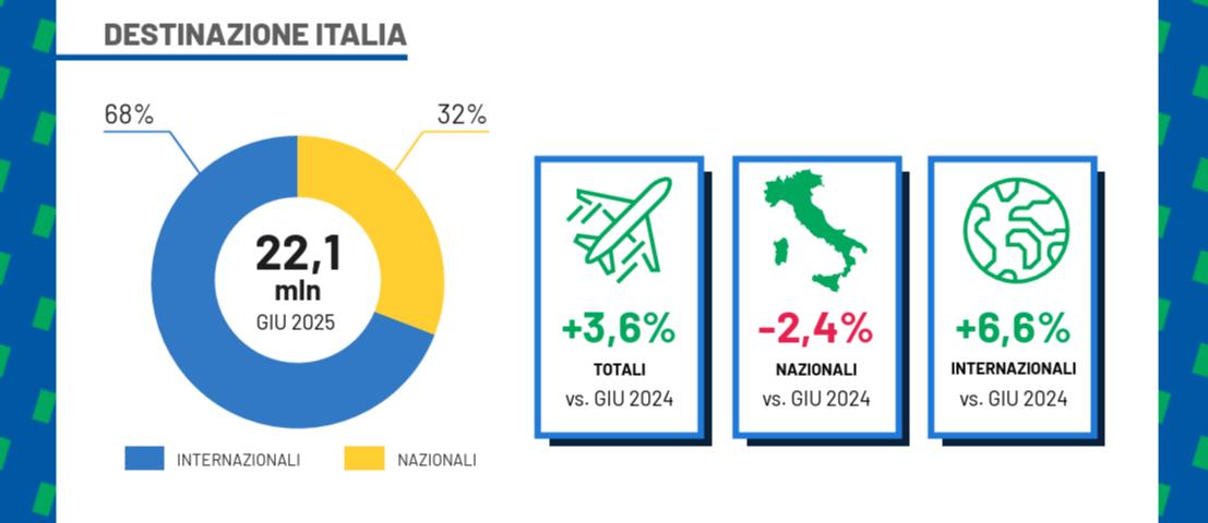 L’Italia consolida la sua leadership turistica in Europa. Secondo i dati del Ministero del Turismo, elaborati su base ISTAT, il mese di giugno ha registrato 16,79 milioni di arrivi e oltre 59 milioni di presenze, con una permanenza media di 3,5 notti per visitatore. Il risultato segna un miglioramento rispetto al 2024 e al periodo pre-Covid, rafforzando l’immagine del Paese come destinazione competitiva e apprezzata.