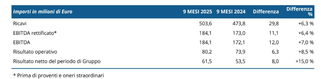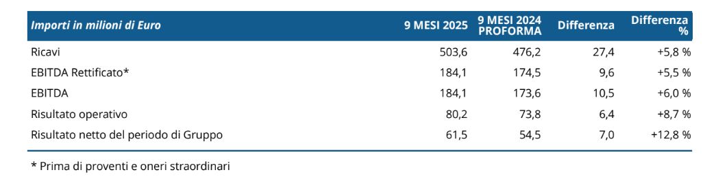 In ragione di quanto sopra descritto, l’EBITDA Rettificato (che esclude elementi non ordinari) è pari a 184,1 milioni di Euro, in aumento di 9,6 milioni di Euro rispetto ai nove mesi 2024.