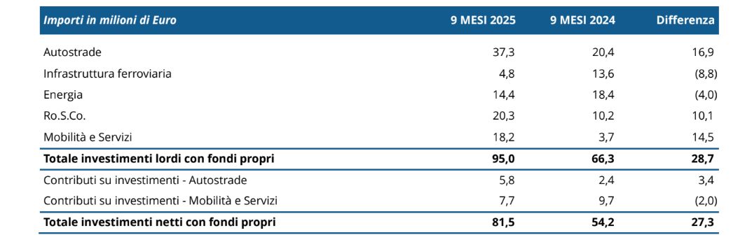 Gli investimenti lordi dei nove mesi 2025 mostrano un’accelerazione rispetto allo stesso periodo del 2024, trainati dai settori Autostrade, Ro.S.Co. e Mobilità, grazie alla realizzazione di distributori di idrogeno, interventi di manutenzione ciclica e miglioramenti sui rotabili TAF, oltre all’acquisto di autobus e attrezzature. Si rileva invece un rallentamento nell’Infrastruttura ferroviaria ed Energia.