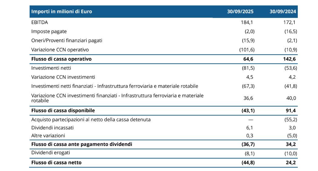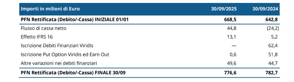 Al 30 settembre 2025 la PFN Rettificata è pari a 776,6 milioni di Euro, che si confronta con 668,5 milioni di Euro al 31 dicembre 2024. La PFN complessiva, che include gli effetti derivanti dall’applicazione dell’IFRIC 12 per gli investimenti relativi al rinnovo del materiale rotabile, è pari a 734,0 milioni di Euro (rispetto a 615,1 milioni di Euro al 31 dicembre 2024).