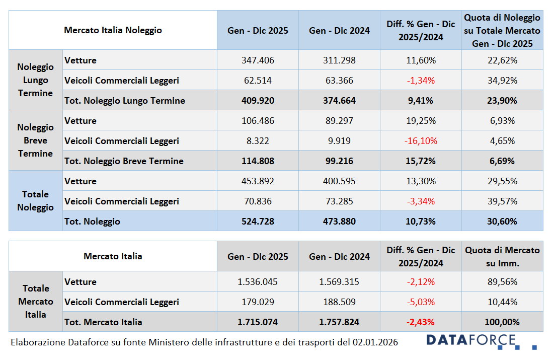 Il noleggio veicoli consolida il proprio ruolo nel mercato automotive italiano e chiude il 2025 con una quota del 30,6% sull’immatricolato nazionale. Un risultato che spicca in un contesto complessivo ancora debole, con il mercato delle quattro ruote in flessione del 2,4%, e che conferma il noleggio come uno dei principali motori della mobilità nel Paese.