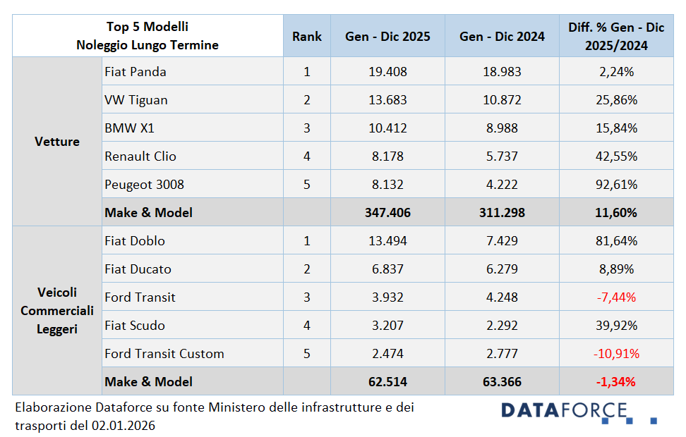 Nel noleggio a lungo termine, la Fiat Panda si conferma il modello più immatricolato del 2025 con circa 19.400 unità (+2,2%), anche se nel solo quarto trimestre il primo posto è stato conquistato dalla Volkswagen Tiguan, che chiude l’anno al secondo posto con una crescita del 25,9%. Completano la Top 5 BMW X1 (+15,8%), Renault Clio (+42,6%) e Peugeot 3008 (+92,6%).