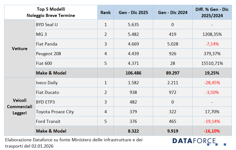 Nel noleggio a breve termine, il 2025 segna un cambio di scenario. Al primo posto sale la BYD Seal U, assente dalla classifica nel 2024 perché in fase di lancio, seguita da MG 3, Fiat Panda, Peugeot 208 e Fiat 600. Nei veicoli commerciali leggeri del breve termine, Iveco Daily mantiene la leadership, davanti a Fiat Ducato, BYD ETP3, Toyota Proace City e Ford Transit.