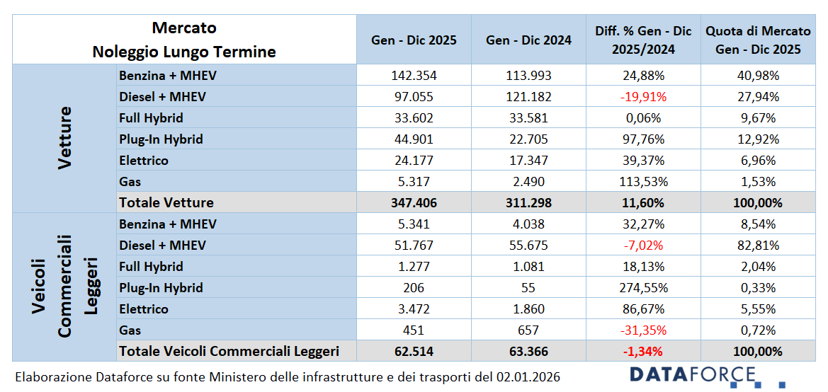 Le ibride “vere”, full e plug-in, raggiungono complessivamente il 22,6% del mercato NLT, con le plug-in hybrid protagoniste di una crescita molto sostenuta (+97,8%) e una quota del 12,9%. Le auto elettriche continuano a crescere: +39,4% nel 2025, con una quota attorno al 7%, superiore alla media del mercato complessivo. Le alimentazioni a gas aumentano in percentuale, ma restano marginali in termini di volumi.