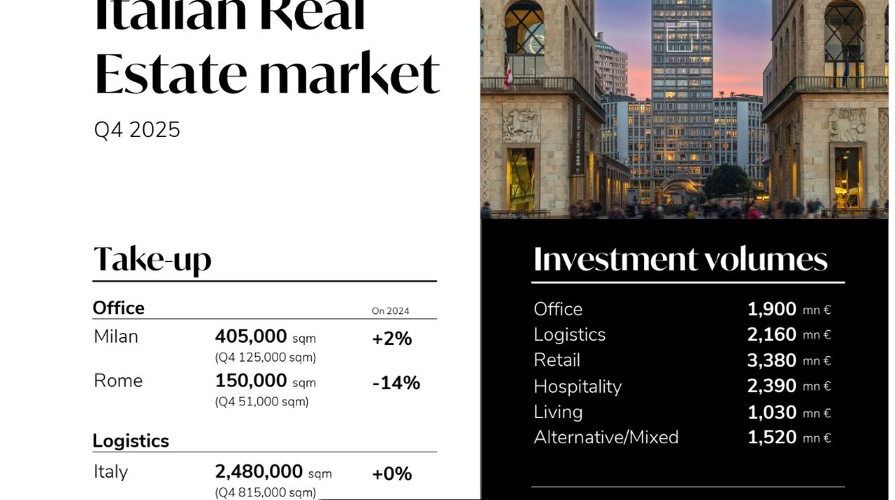 Il settore Uffici ha evidenziato una performance particolarmente solida nel quarto trimestre, con investimenti pari a circa 800 milioni di euro, in aumento del 20% rispetto allo stesso periodo del 2024 e miglior risultato trimestrale degli ultimi tre anni. Complessivamente, il 2025 si chiude con volumi pari a 1,9 miliardi di euro, in calo del 14% su base annua, riflettendo un mercato che resta selettivo ma dinamico nelle operazioni di maggiore qualità. Milano si conferma il principale polo di attrazione dei capitali, catalizzando oltre il 70% degli investimenti, seguita da Roma con circa il 20% del totale nazionale.