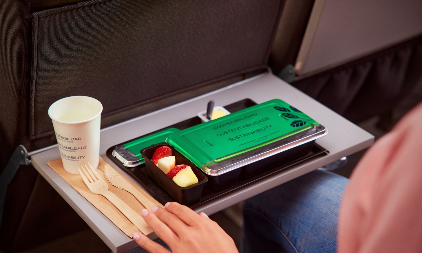 Una delle iniziative attuate dal gruppo è stata la sostituzione della plastica monouso con materiali organici, come la carta nel caso delle nuove tazze, il bambù per le posate, la canna da zucchero per i coperchi dei contenitori e materiali riutilizzabili per contenitori e vassoi nella cabina economica e borse di stoffa nella cabina business.