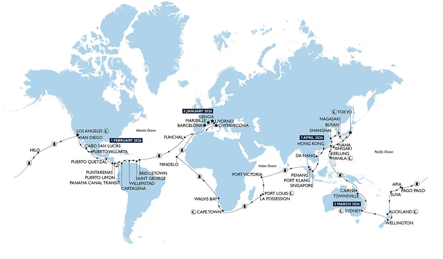 Il viaggio, che si concluderà nel capoluogo ligure il prossimo 16 maggio, prevede 46 tappe in contesti geografici radicalmente diversi. Dopo il debutto nel Mediterraneo e la traversata atlantica, la nave punterà verso i Caraibi e attraverserà il Canale di Panama per risalire verso il Messico e la California. Da lì, la rotta si farà ancora più esotica: Hawaii, Polinesia, Nuova Zelanda e Australia, prima di risalire verso l’estremo Oriente (Giappone, Cina e Vietnam) e fare rotta verso l’Oceano Indiano e il Sudafrica.
