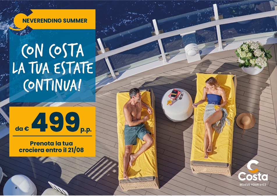 L’estate continua a bordo delle navi Costa, grazie a “Neverending Summer”, la nuova promozione valida per le prenotazioni effettuate entro il 21 agosto su una selezione di partenze, da settembre 2023 a marzo 2024. Gli ospiti che sceglieranno questa offerta potranno, dunque, trascorrere una vacanza con Costa a un prezzo vantaggioso, a partire da 499 euro per persona.