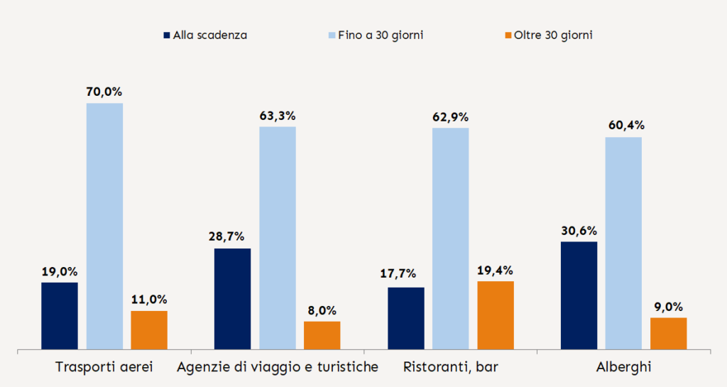 Dal punto di vista dei pagamenti commerciali, le imprese turistiche mostrano maggiori difficoltà rispetto alla media italiana: solo il 20% delle aziende rispetta le scadenze, mentre il 17,4% registra ritardi gravi nei pagamenti, con tempi superiori ai 30 giorni. Particolarmente problematici sono i settori della ristorazione e dei bar, dove i pagamenti puntuali si verificano solo nel 17,7% dei casi, mentre i ritardi gravi superano il 19%, una percentuale più che doppia rispetto a quella di agenzie di viaggio e alberghi.