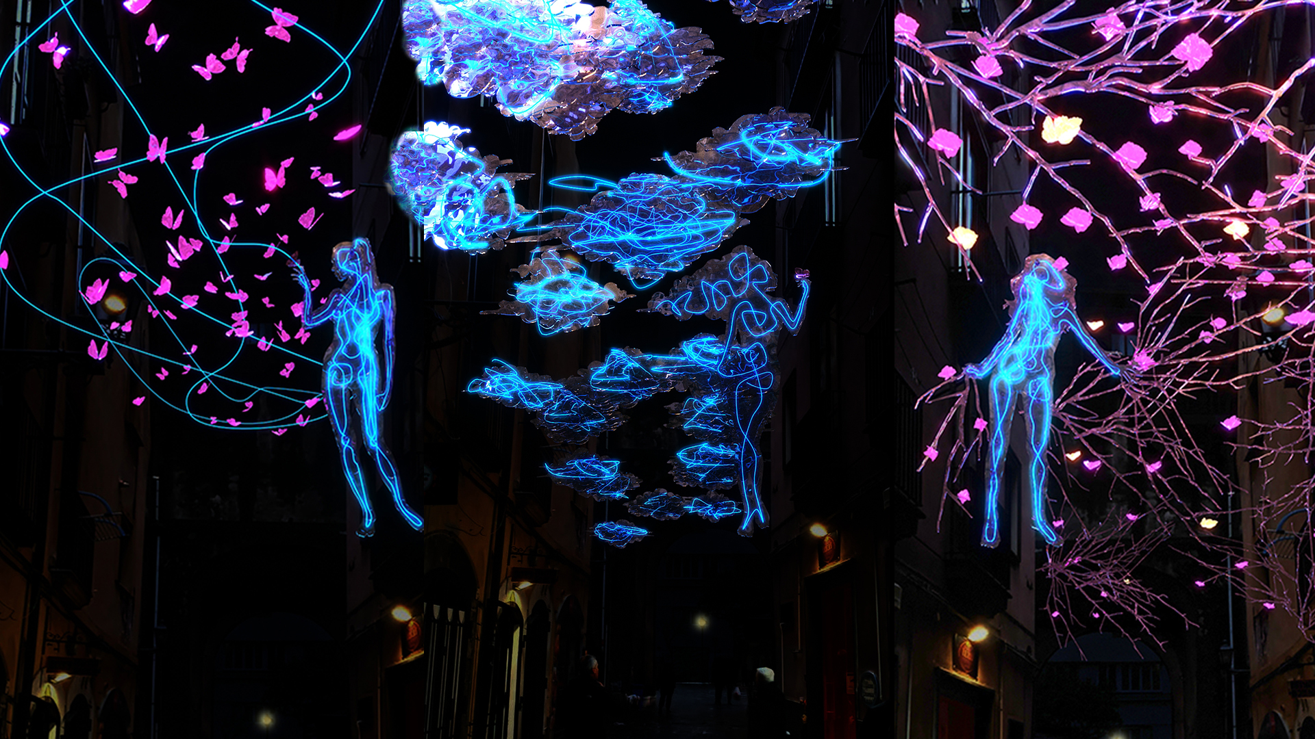 Il tracciato si snoda tra Corso Vittorio Emanuele, la Villa Comunale, Piazza Flavio Gioia e molte altre aree cittadine. L’allestimento è pensato per una fruizione continua, con scenografie immerse nel tessuto urbano, architetture luminose e installazioni interattive che trasformano le vie in un percorso narrativo. Tutte le opere utilizzano tecnologie LED a basso consumo con sistemi di gestione intelligente, una scelta che permette di ridurre i consumi energetici e al tempo stesso valorizzare l’impatto visivo.