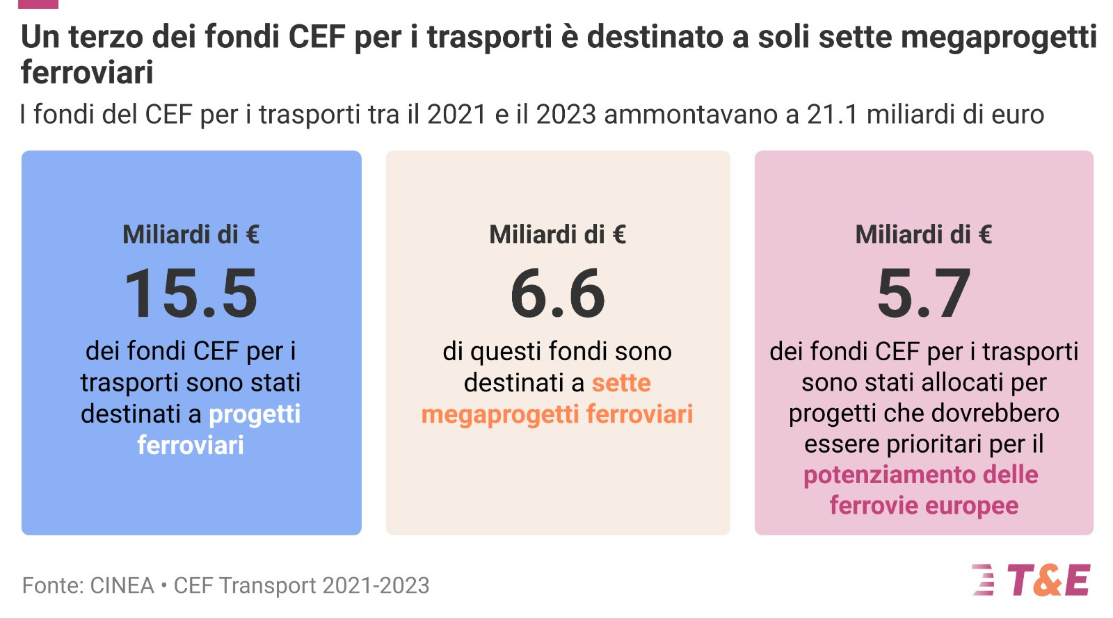 Nel triennio 2021-2023 sono stati stanziati 6.6 miliardi di euro per sette megaprogetti ferroviari europei: Rail Baltica, Galleria di base del Brennero, Collegamento ferroviario Lione–Torino, linea ad alta velocità Porto–Lisbona, Galleria del Fehmarnbelt, Y Vasca e Stoccarda 21. Secondo T&E, nonostante la maggior parte di queste opere di grande portata sia fondamentale per creare una rete ferroviaria europea realmente integrata, i megaprogetti presentano diverse criticità, poiché spesso richiedono risorse superiori rispetto a quelle inizialmente previste e tempi di realizzazione più lunghi rispetto ai piani originali.