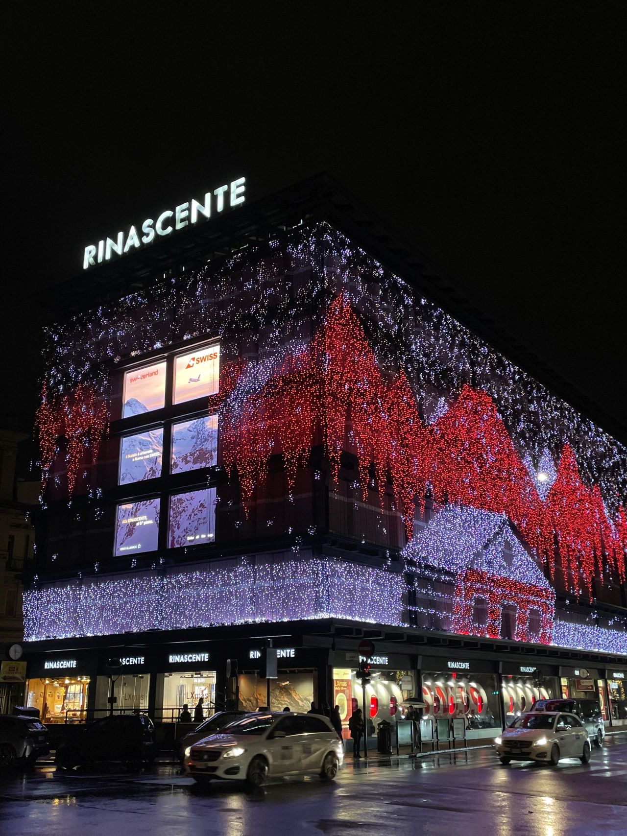 L’intervento è completato da un progetto di light design architetturale che avvolge la facciata della Rinascente. Per tutta la durata del takeover, l’edificio assume una veste luminosa pensata per introdurre il pubblico nell’atmosfera delle festività e nei richiami alla cultura svizzera.