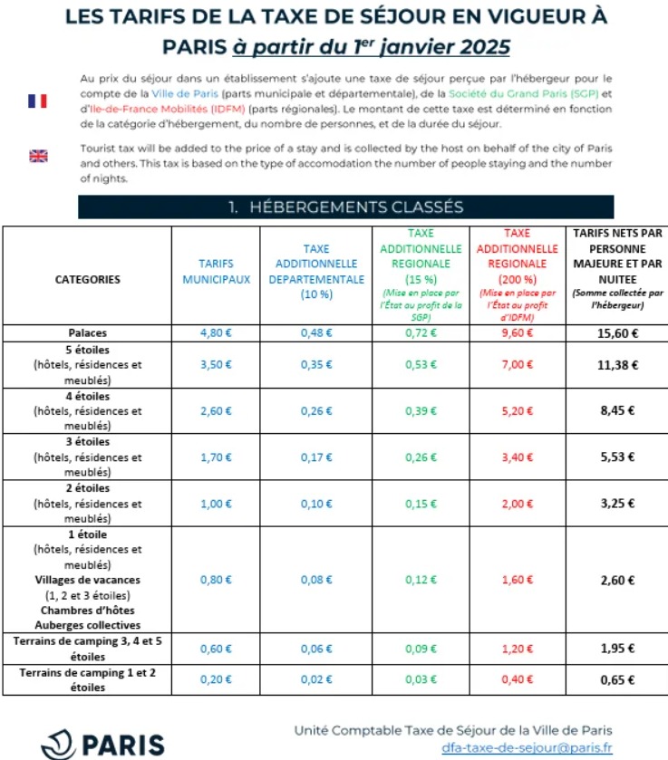 Le tariffe della tassa di soggiorno a Parigi per il 2025, comprensive delle sovrattasse regionali (15%) e dipartimentali (10%), nonché dell’ulteriore imposta del 200% introdotta nella regione Île-de-France, sono le seguenti: