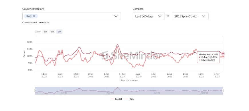 - Le strutture italiane registrano un volume di prenotazioni leggermente superiore rispetto allo stesso periodo del 2019 (100,63%).
