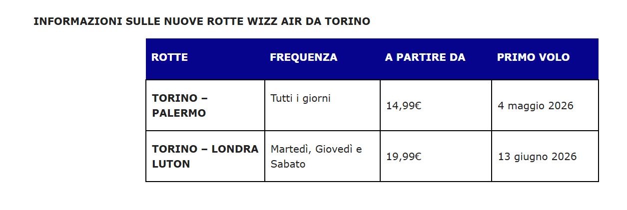 “Siamo molto felici della crescita che Wizz Air sta registrando sul nostro aeroporto – ha commentato Paolo Papale, Direttore Sviluppo Aviation di Torino Airport -: negli ultimi anni il ruolo della compagnia si è rafforzato molto e siamo certi che le novità portate dalla stagione estiva 2026 contribuiranno ulteriormente a questo sviluppo. I nuovi voli per Londra Luton e per Palermo rappresentano una ottima occasione di crescita turistica anche per il territorio piemontese, sempre più raggiungibile da un crescente network voli. Ad essi si affiancano poi le nuove rotte per Chisinau e per Budapest, che proseguono dalla winter 2025, con la capitale ungherese che sarà collegata di lunedì, mercoledì e venerdì”.
